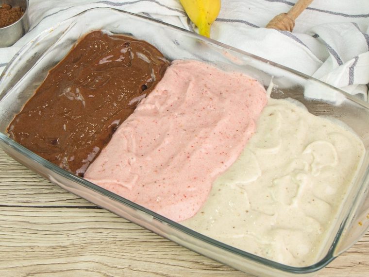 Three flavors in one batch: banana, strawberry, and chocolate.