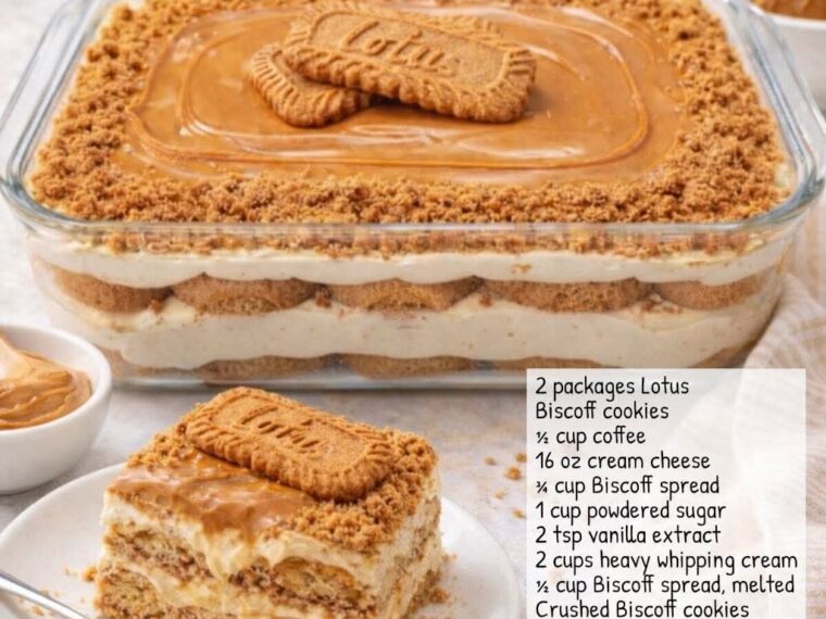 Lightly dip Biscoff cookies in milk or coffee. Arrange a layer of cookies in the dish. Spread half of the Biscoff cream filling. Add another layer of dipped cookies. Spread remaining Biscoff cream evenly.