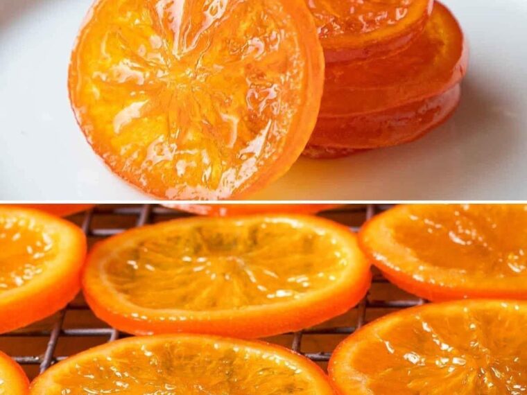 The image shows perfectly sliced oranges, gently cooked in syrup until translucent, then dried to achieve that irresistible shiny finish. They’re not only delicious but also incredibly versatile—perfect for desserts, snacks, or even decoration.