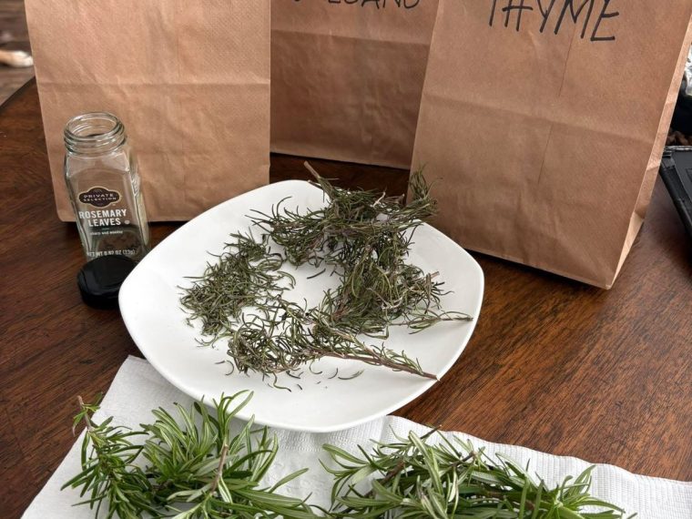 4) Place herbs loosely in plain paper bags, roll top of bag closed and place standing upright in a dark, warm place (I.e. top of cabinet in laundry room). Leave alone until herbs are completely dried out, usually a few weeks.