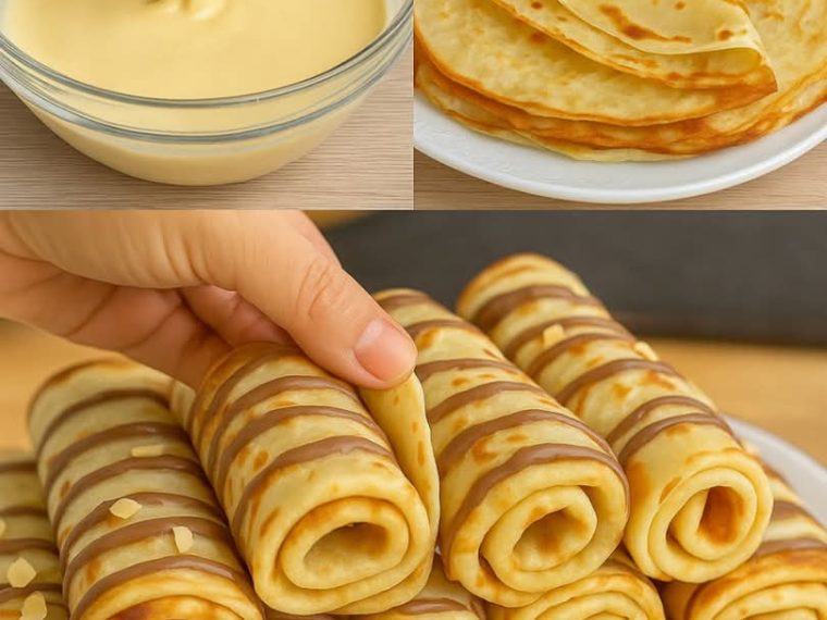 Spread chocolate on each pancake while it is still warm.