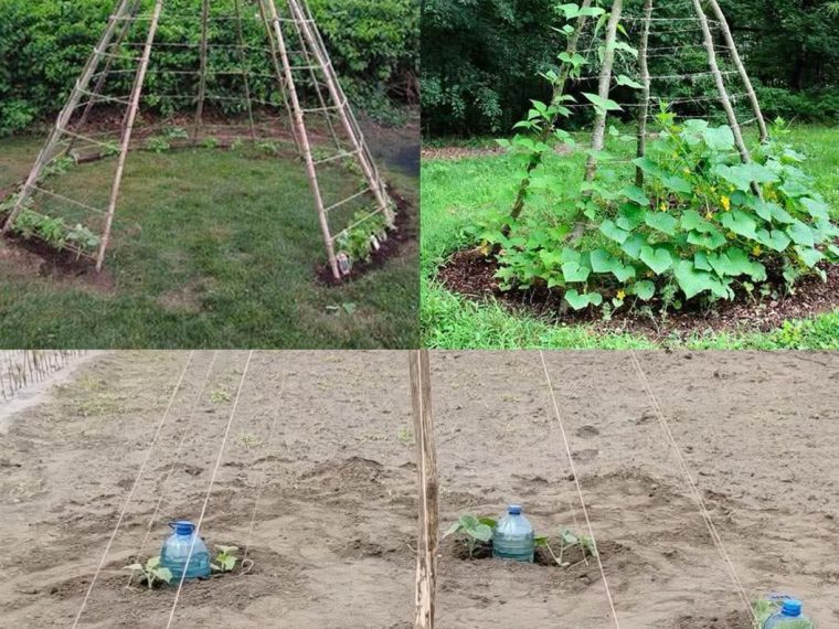 wooden teepee support for growing cucumbers