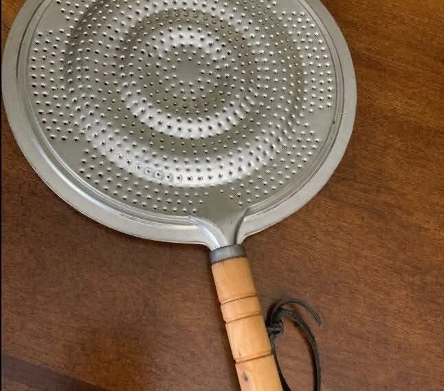 Just cast iron or steel, perforated to perfection—and a smooth wooden knob you can grab without burning your fingers.