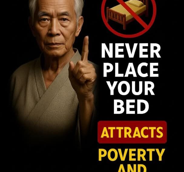 The image presents a bed placed with the headboard facing a door, which in Feng Shui is known as the “coffin position.” Sleeping with your feet pointing directly toward the door is thought to symbolize d3ath or the exodus of vital energy. According to this belief, this position: