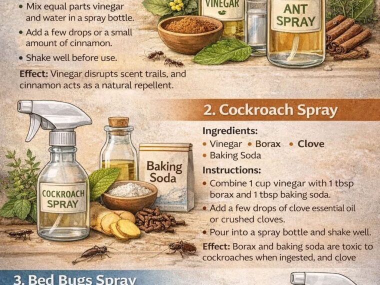 Here’s a simple DIY Natural Insect Spray Guide based on the image you shared. Each spray targets a specific pest using common household ingredients. These mixtures are eco-friendly and chemical-free.