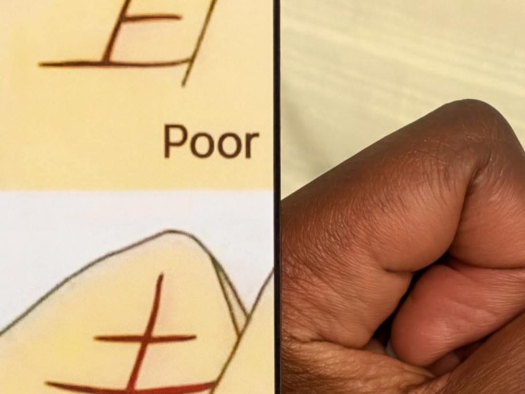 The top half of the image shows a closed palm with a crossed line near the thumb, labeled “Poor.” This suggests that, according to the belief shown, certain markings on the hand correlate with a lack of financial wealth.