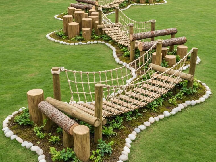 a meticulously designed nature-themed obstacle course or balance playground, set within a lush, well-manicured green lawn. The aesthetic is organic and “naturalistic,” prioritizing raw wood and rope over traditional plastic or metal playground equipment.