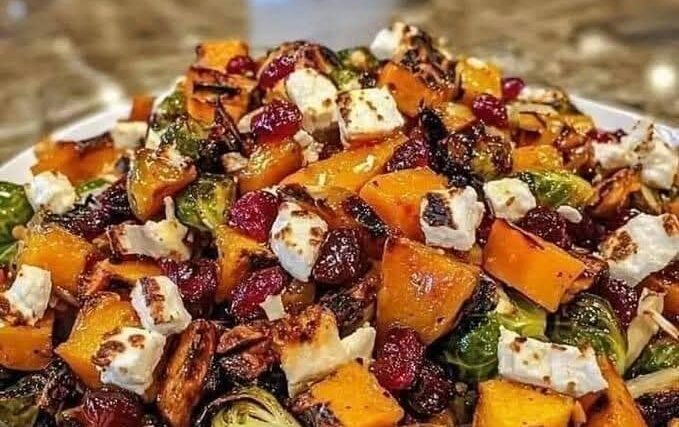 How to make Cranberry-Glazed Roasted Butternut Squash, Brussels Sprouts, and Sweet Potato Salad with Cranberries and …
