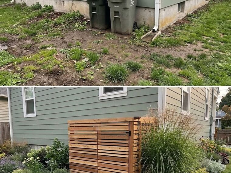Building a slatted cedar enclosure for your trash cans hides unsightly bins and stops the wind from blowing them across your yard during a storm.