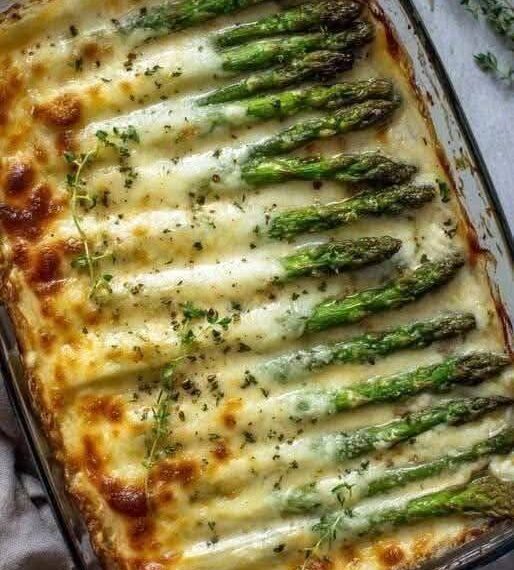Heat the oven to 400 degrees. – Wash and trim the asparagus, then grease a 9 x 13 baking tray and place them in it. In a skillet, melt the butter over medium heat, then add the soft cheese, heavy whipping cream, chicken broth, garlic powder, paprika, Italian seasoning, salt, and pepper. Stirring constantly until ingredients are well blended.