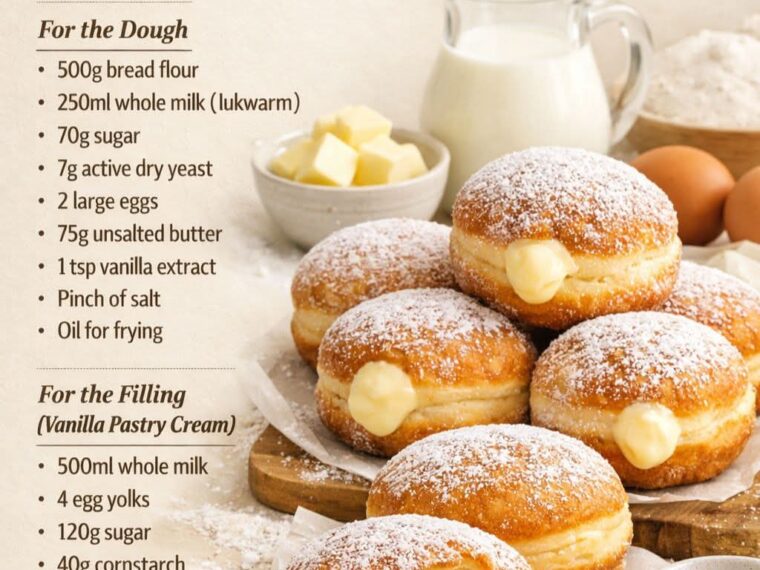 - Make a hole in each donut, fill with cream, and dust with powdered sugar.