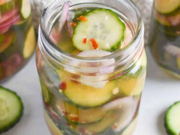 3. Combine water, vinegar, sugar, and salt, stir over medium heat until fully dissolved (1 minute). Cool slightly, then pour over cucumbers.
