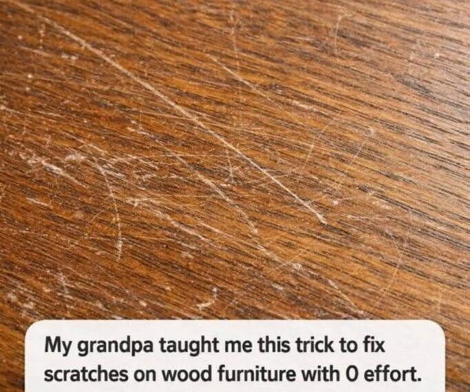 Mix equal parts olive oil and white vinegar and rub it into the scratch with a soft cloth. The vinegar helps clean the area, while the oil soaks into the wood and blends the tone — especially effective for light scratches.