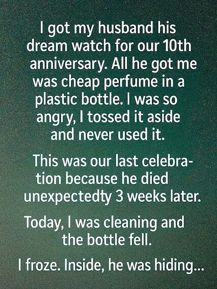 I always imagined our 10th anniversary would be perfect — candlelight, laughter, a meaningful exchange of gifts that showed how far we’d come together. I saved for months to buy my husband the watch he’d always dreamed of, imagining the joy on his face when he opened it. When he handed me a small plastic bottle of perfume in return, my heart quietly sank. It looked cheap, the kind of thing you’d grab at a gas station on impulse. I smiled anyway, trying to hide my disappointmen