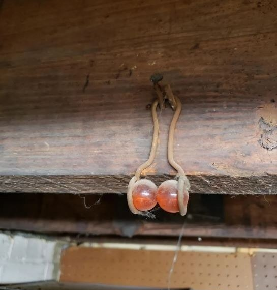 Two round objects — about the size of marbles — cradled inside a small hanging bracket or holder. It looked intentional, not random. The wire hanger seemed carefully bent to secure them in place. It had clearly been there for years, possibly decades.