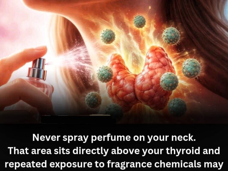 Repeatedly spraying perfume on your neck may disrupt hormone signaling because the skin there is thin, highly absorbent, and sits directly above the thyroid gland, which can increase the absorption of endocrine disrupting chemicals found in most synthetic fragrances.
