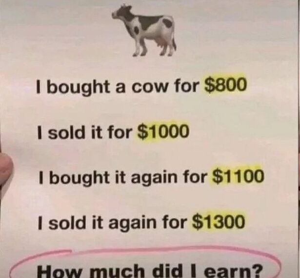 Picture this: you spend $800 on a cow and make $1,000 when you sell it. After some time has passed, you reinvest $1100 in the cow and make $1300 from its sale. In all, how much money did you earn?