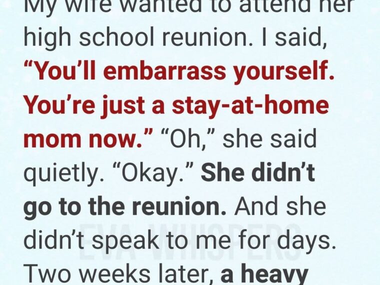 Instead of support, I laughed. It was a careless, harsh laugh. I asked why she would even want to go, implying she had nothing to boast about. I reduced all her efforts, sleepless nights, and family dedication to “wiping noses” and managing chaos. I told her she was “just a stay-at-home mom.” The silence that followed was heavier than any argument. Anna withdrew, and the warmth in our home vanished.