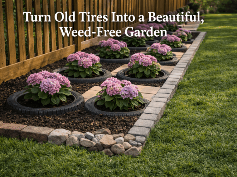 Using old tires combined with cardboard or weed barrier, you can create a structured, aesthetic space that looks professionally done — without spending much money.