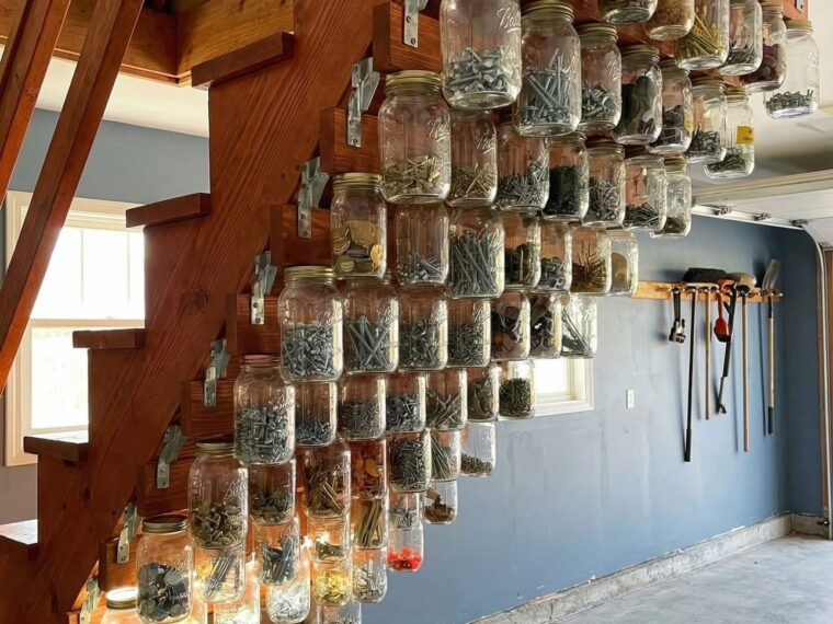 Under-stair mason jar storage turns wasted space into a highly organized hardware station. It’s affordable, customizable, and incredibly practical — especially if you love neat, visible systems.
