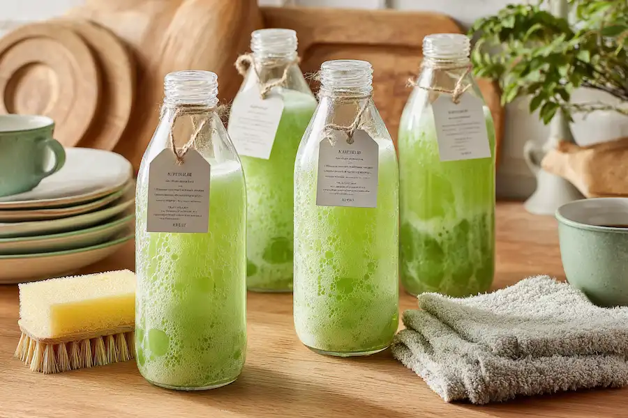 Pour the finished detergent into clean bottles, such as reused dish soap containers or a 2-liter bottle. This recipe yields around 4 liters of detergent, giving you an impressive supply for regular household use.