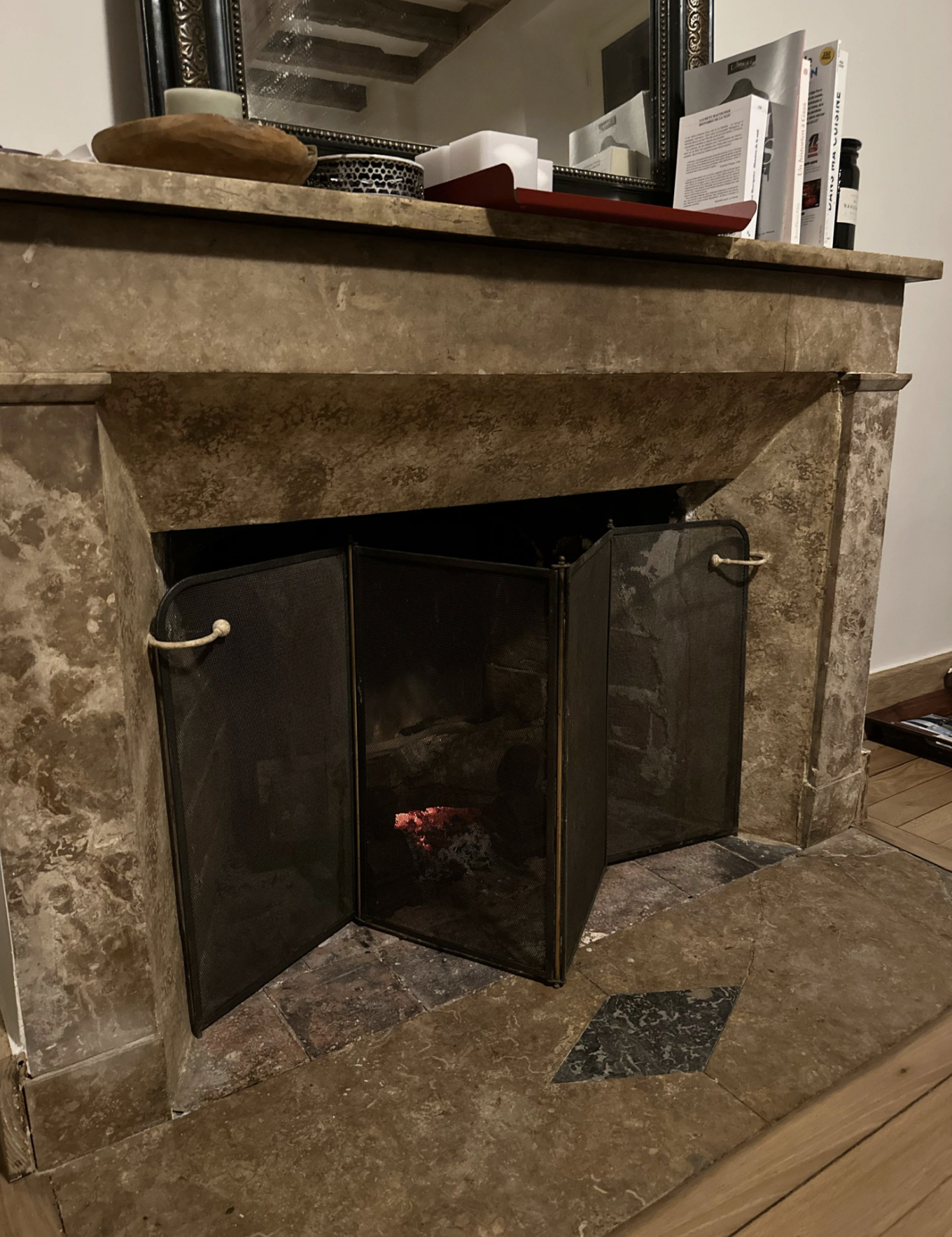 People hung metal wire mesh ember curtains from a rod along the top edge of the fireplace. They could draw the curtains shut to create a barrier between the flames and the room beyond. The purpose of these curtains was to catch flying embers or tiny cinders distilling from the half-burned logs.