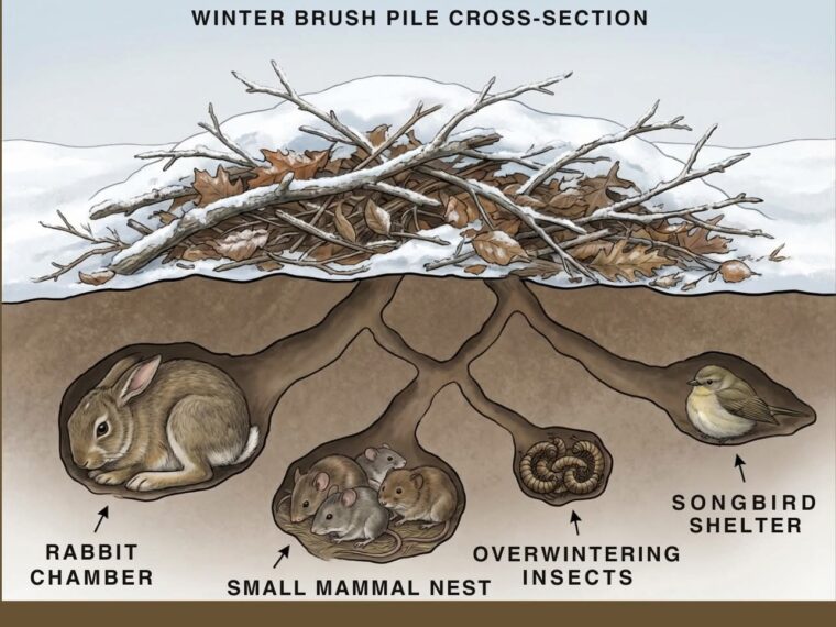 A simple brush pile can mean survival for small mammals, birds, insects, and countless hidden species that rely on warmth and protection during the harshest months of the year.
